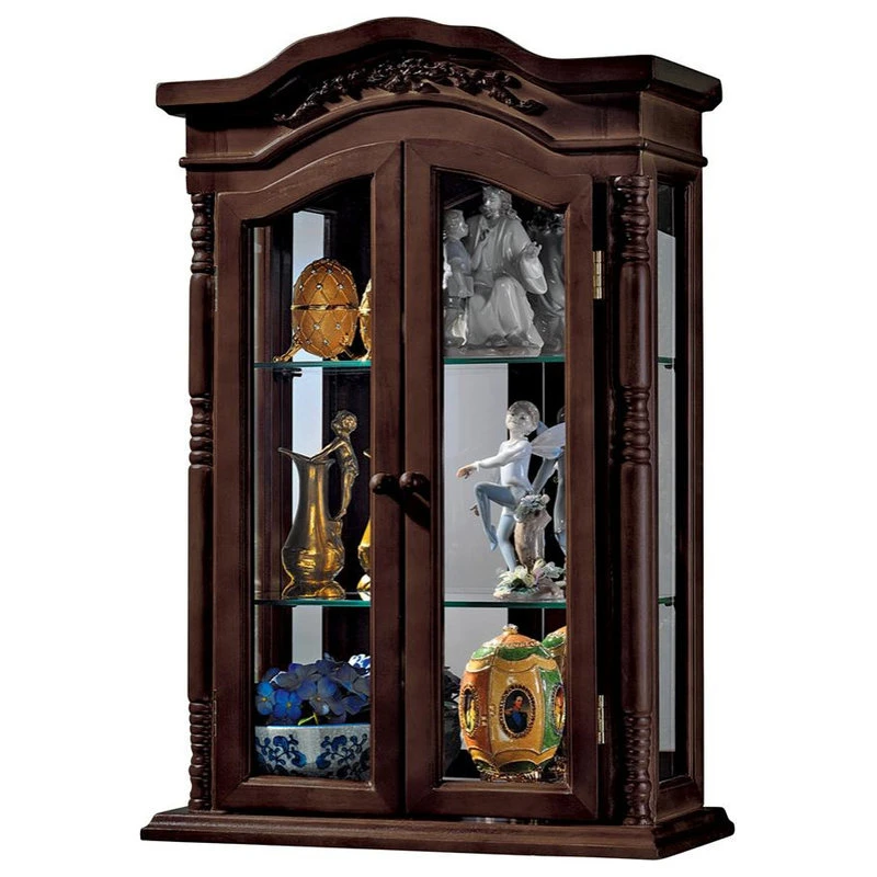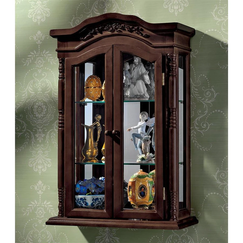 Two hand-turned rails, a gently curved pediment, and fine shoe molding detail draw instant attention to our clean-lined, mirrorbacked collectors’ cabinet that features two removable glass shelves and glass side panels to allow maximum light. Crafted of solid hardwood, it boasts two framed glass doors with wood knobs that open separately for unobstructed viewing from all sides. Our Design Toscano-exclusive wall cabinet boasts a perfected, hand-finished hue to accent any decor and ample space to focus admiration on your statuettes, enameled eggs and other cherished heirloom collectibles. 18″Wx7″Dx27″H. 13 lbs.