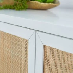 Transitional style media sideboard in matte white featuring natural rattan door front inlay with brass and acrylic decorative hardware.