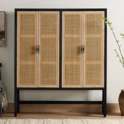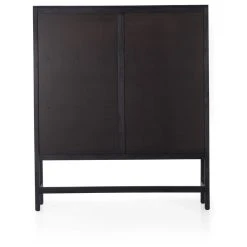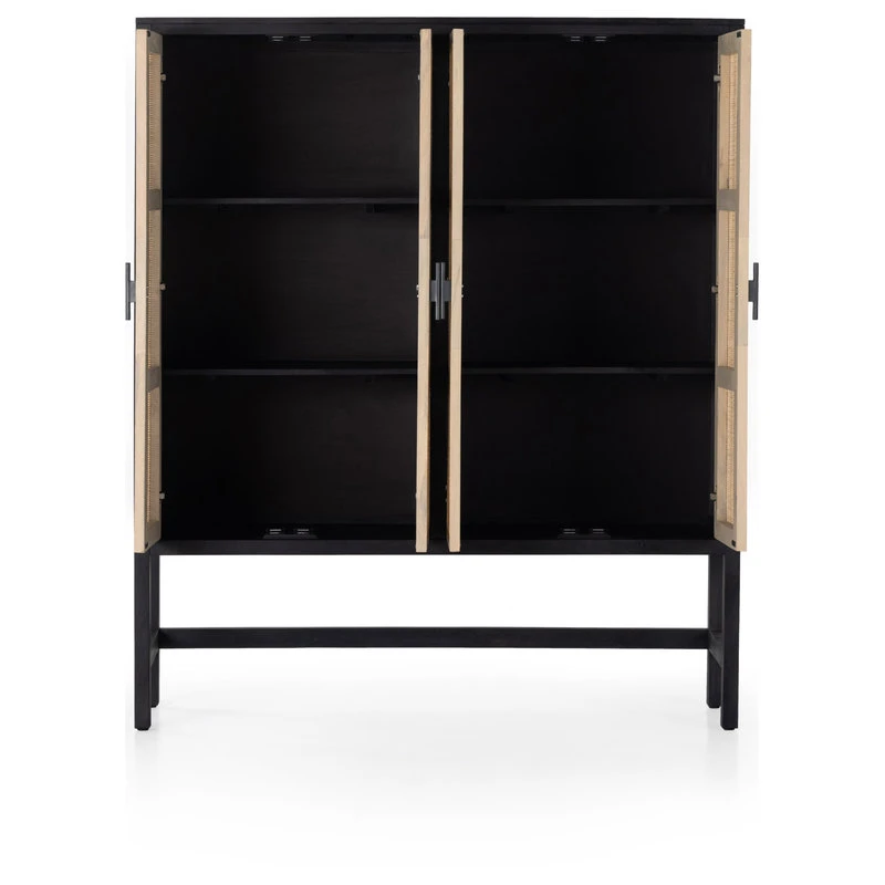 Two-tone contrast with a textural twist. Black-washed mango frames woven cane doors, which open to reveal spacious interior storage. A simple Parsons-style base and blck iron hardware pulls add eye-catching contrast to modern cabinetry.