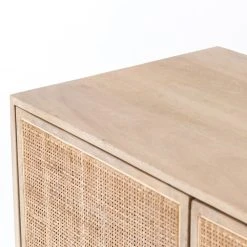 Midcentury-inspired style with an organic twist. Surrounded by mango casing, light cane weaves for a fresh look with natural depth. Angular gunmetal-finished iron legs offer an intriguing contrast of texture and tone.