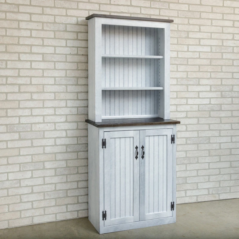 Give your living, dining, or kitchen area a touch of rustic farmhouse charm with the addition of this handmade china cabinet. This cabinet comes equipped with 3 upper shelves and a lower cabinet with 2 doors that conceal 2 additional shelves within. Each removable shelf is adjustable, making this piece the ideal storage solution for kitchenware and daily essentials. This cabinet comes in your choice of 9 color variations, each accentuated with a 2-tone color finish. With a natural distressed finish, each 2-door hutch features unique coloring and knots, making each cabinet truly one of a kind.