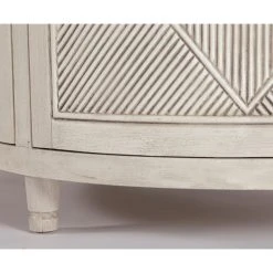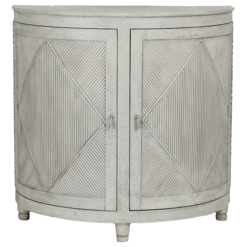 Chelsea Demilune by Gabby. This wooden half-moon demilune cabinet is the perfect way to add curves to a space. The distressed white wood finish gives this piece a farmhouse vintage appeal. 2 fixed shelves.