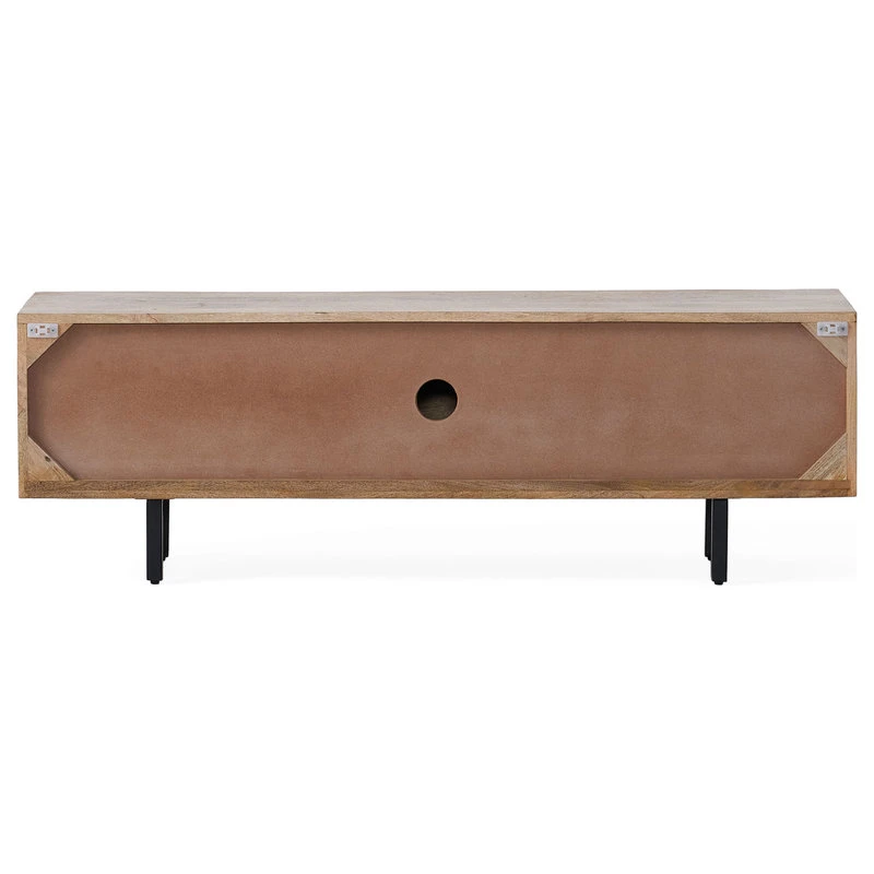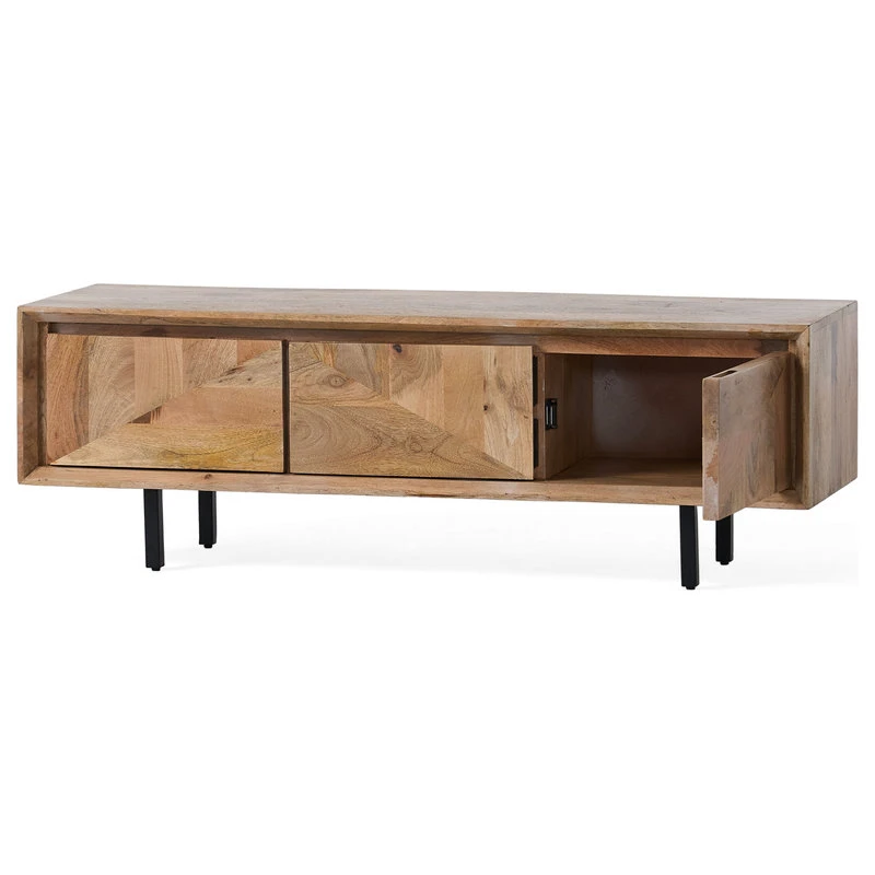 Spice up your movie nights with a TV stand that will enhance the way you watch television. Featuring beautiful mango wood for a one-of-a-kind design, this accessory brings a carefree boho look to your home, complemented by its smooth metal legs for a modern touch. This TV stand is completed with plenty of storage space, giving you ample space to organize your items. Blending seamlessly with your existing decor, this TV stand will bring out the best of your interior space.