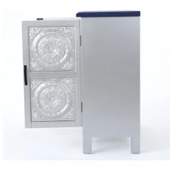 Add a unique vibe to your decor with our stamped-tin cabinet that will light up any room in your home. Created for both functionality and impeccable style, our modern firwood cabinet brings a chic twist to a traditional design. This brilliant silver-finished cabinet will transform your living space with a hand-crafted touch while giving you all sorts of options to remove clutter. Accented with beautifully carved cabinet doors, our impressive cabinet is the perfect addition that will have all your guests in awe of your decor.