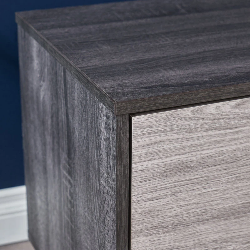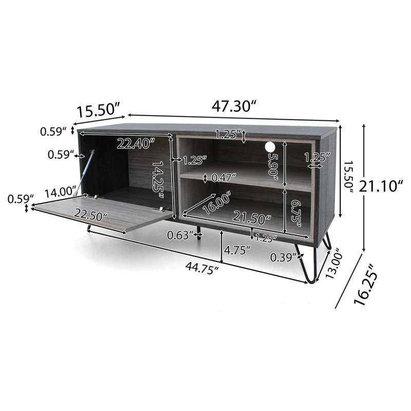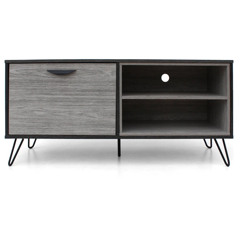 Every home entertainment area should have a stage set for your television and media players. Featuring a two-toned wood finish and stunning hairpin legs, our TV stand brings together mixed materials in perfect harmony, making this piece ideal for any living room. This stand is completed with ample storage to allow a clutter-free area for your entertainment systems. Finished with a sleek modern industrial look, our television stand brings both sturdy support and edgy style to any room in your home.