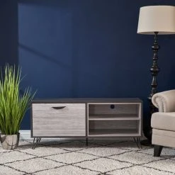 MODERN INDUSTRIAL: Our TV stand incorporates sleek metal accents with a wood look to create an understated modern industrial design. Featuring beautiful hairpin legs, this accessory offers a chic aesthetic to any home.