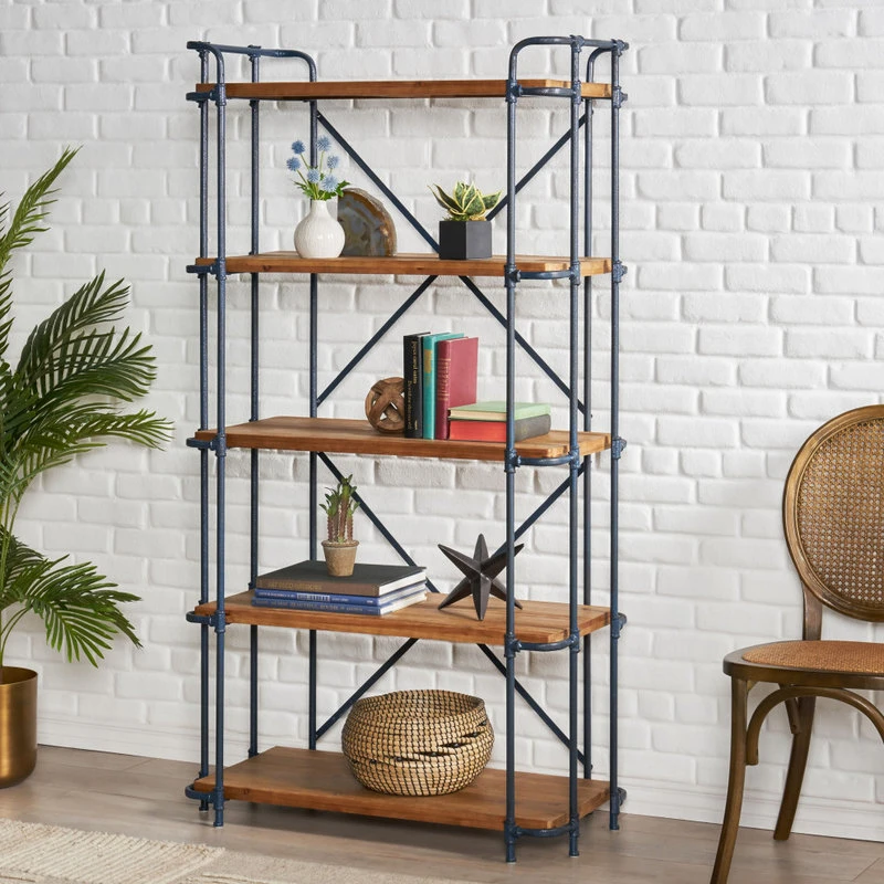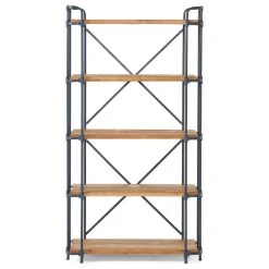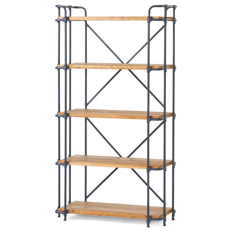 INDUSTRIAL DESIGN: Our bookcase incorporates a sleek metal frame into its construction to create an understated industrial design. With a combination of iron and smooth wood shelves, this bookcase offers a raw, unfinished look to your home.