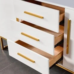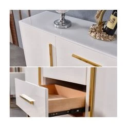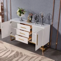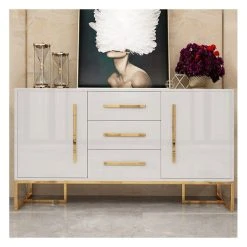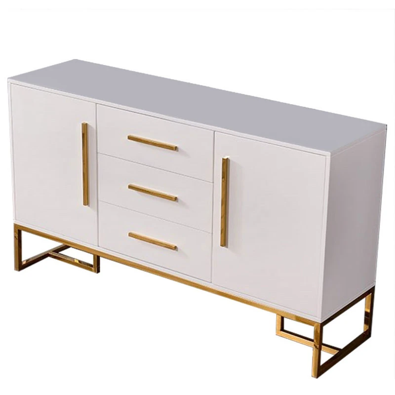 Add extra storage space and unique style to your home with this buffet table. Featuring a rich golden stainless steel base, this stunning sideboard cabinet offers a stylish, contemporary touch to your living space. Striking 2 doored cabinets and 3 drawers, it offers ample space to stash serveware, silverware, and dishware, helping you keep the whole space decent and tidy without sacrificing style. It is crafted from solid and manufactured wood in a perfect rectangular form, while the tempered glass tabletop coordinates well with premium metal handles to reinforce the serving longevity. A flawless choice to update your home.
