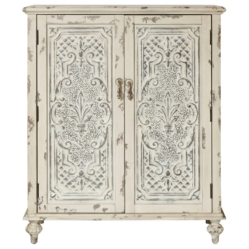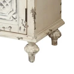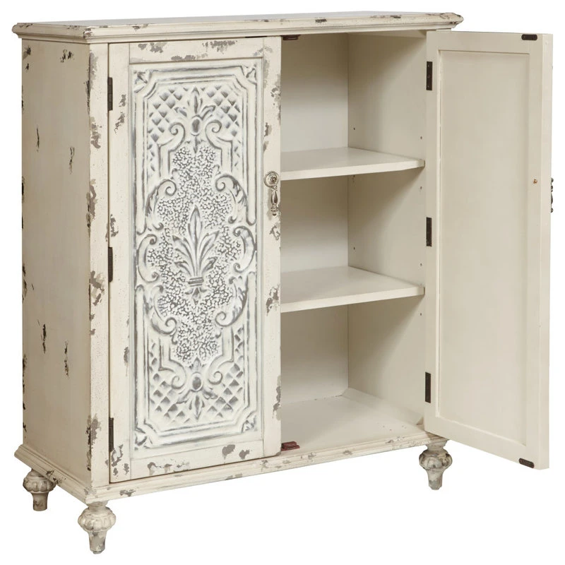 This small accent chest captures the aura of high-end shabby chic. The two doors feature tin panel inspired fronts inspired by antiques and the aged, painted white finish highlights the scroll and fleur de lis design. One adjustable shelf behind the ornate-designed doors. The softly rounded, turned feet finish off the case.