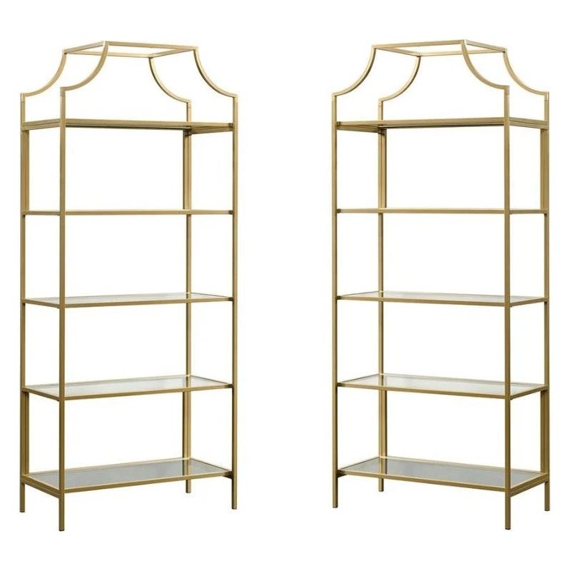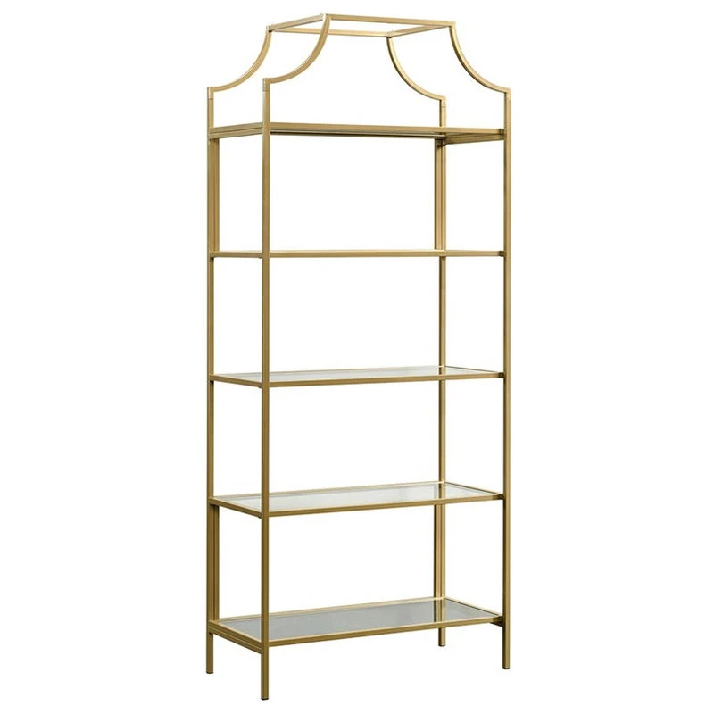- 5 Shelf Bookcase in Satin GoldGive your space a sophisticated update with this bookcase from the International Lux collection. It features open shelving with safety-tempered glass so you can store and display books, plants, decor and more. Constructed from metal and finished in Satin Gold, this elegant bookcase will have any room in your home feeling luxurious and chic.