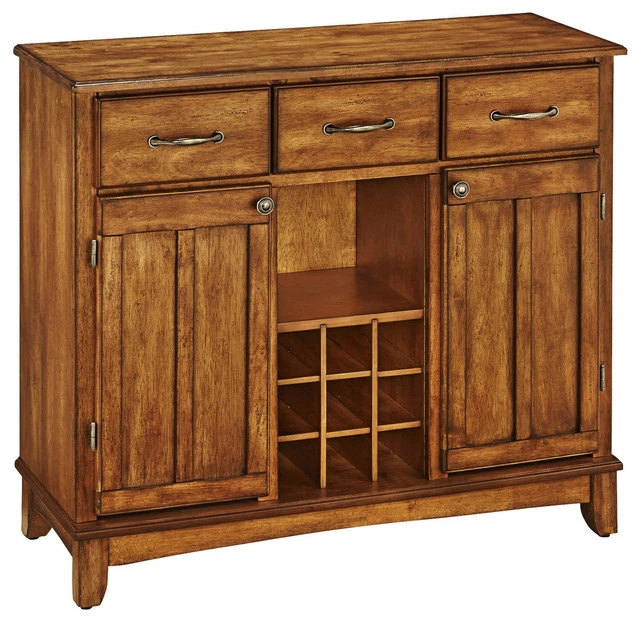 Store it all, display it all, and have it all with the Homestyles Buffet of Buffets Server. Whether used in the kitchen, dining room, or anywhere else, it brings organization to your life and style to your home. The variety of storage options including drawers, cabinets and a wine rack gives you the flexibility to figure out what’s just right for you. Pack more storage into a smaller footprint with this cottage oak buffet that easily coordinates with a variety of environments.