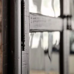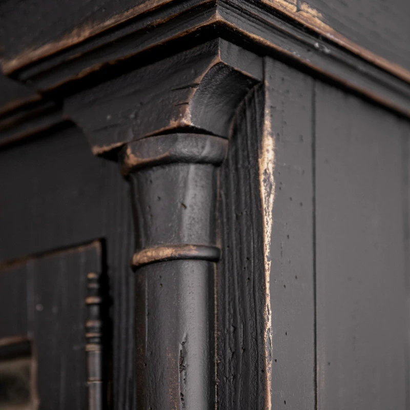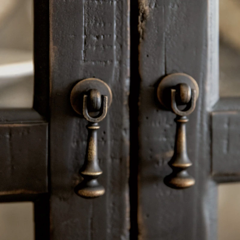 The striking silhouette of the two-door Ciao Bella Display Cabinet with wood-framed beveled glass doors will bring the character of European farmhouses to your home. Crafted of Pine, Poplar and Hardwood Solids with Maple and Pine Veneers, the exquisite black finish looks like it has aged through generations. As practical as it is pretty, the display cabinet has 2 adjustable wood-framed glass shelves and one fixed wood-framed glass shelf. The burnished brass hardware is tear-drop shaped.