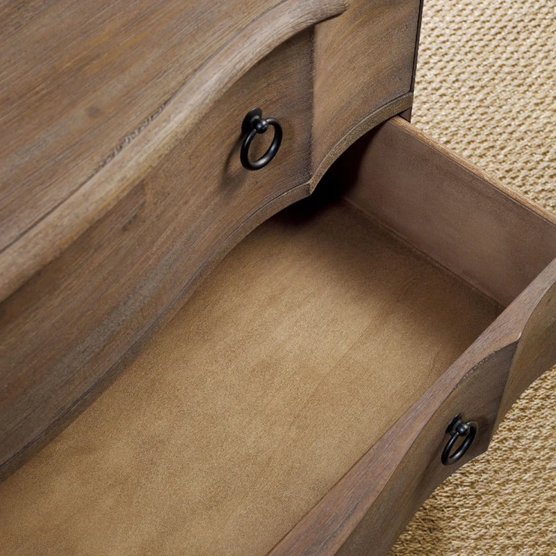 Bring the romance and rustic charm of the storied island of Corsica to your bedroom, hall or family room with the Corsica 3-drawer Bachelors Chest. The timeless and elegant silhouette is made casual by the wire-brushed, artisan natural finish with a reclaimed character on exotic beautiful Acacia wood, known for its tactile hand, knots and color variations in serene organic hues of gray, rose and natural. The top drawer is felt-lined for storing delicates or jewelry, and the bottom drawer is cedar lined. A touch light that illuminates from the bottom of the chest offers ambience. Burnished bronze hardware and chic bun feet complete the look.