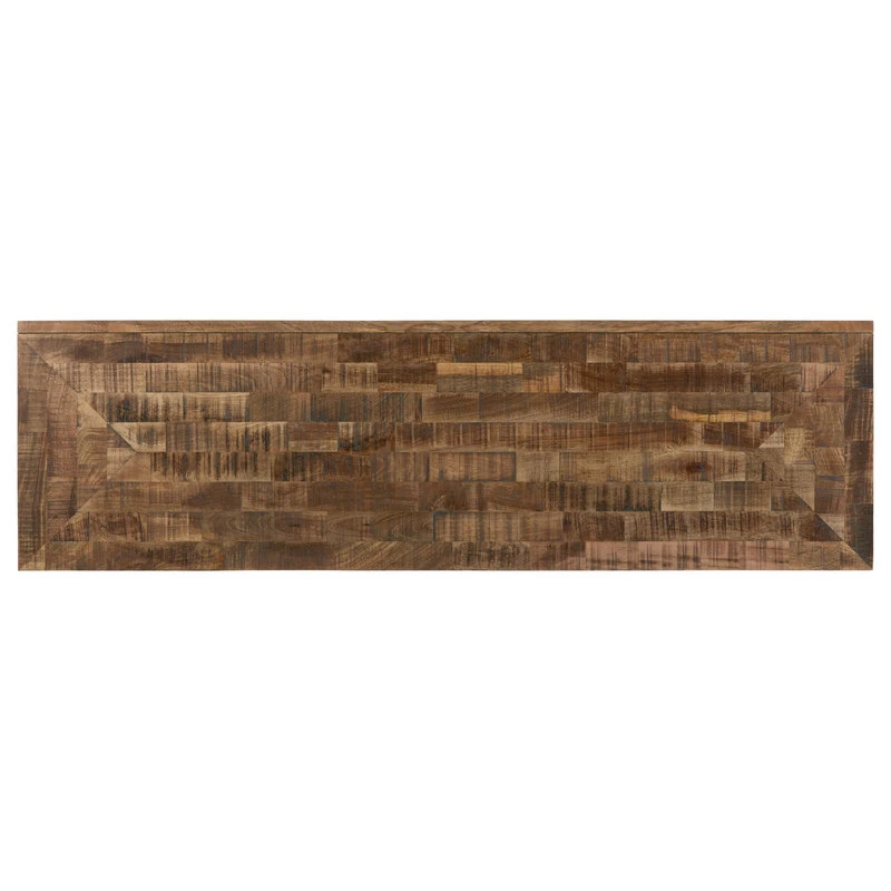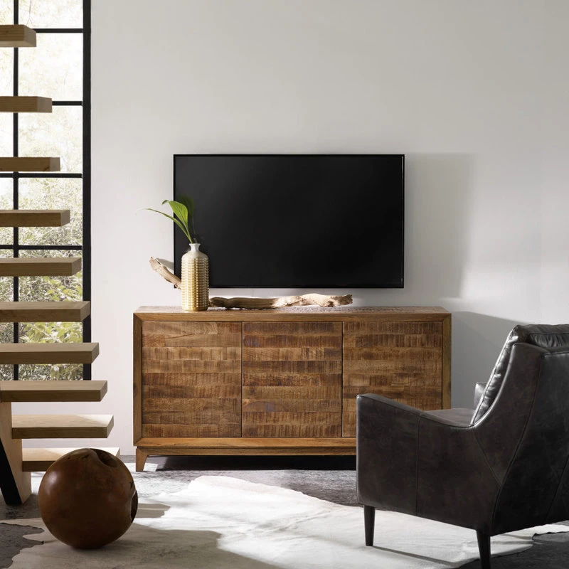Crafted of Solid Wood Mango with a patterned veneer design and organic color palette, the 64-inch entertainment console offers stylish storage for clutter-free entertainment. Accommodating up to a 65-inch TV, the�piece offers wire management and 3 doors with touch-latch operation. The left side set of doors has a center partition.