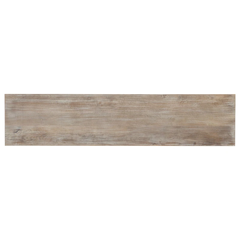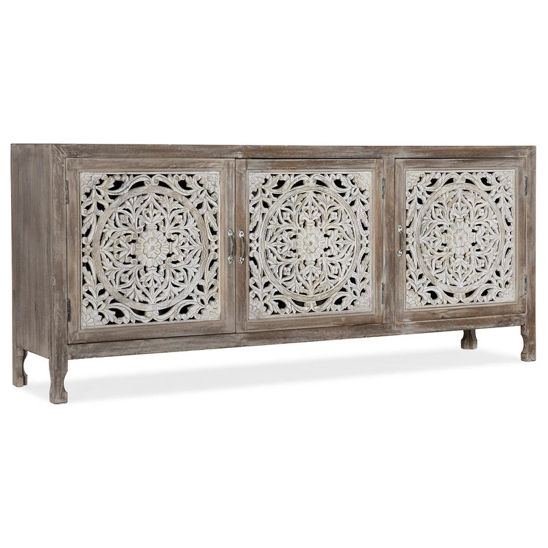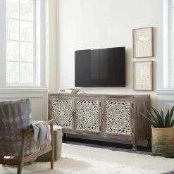 Exquisitely hand carved Mango Wood on the front of this three-door entertainment console creates an iconic and imposing stylish look for your home. The serene neutral finish is accomplished with a cream glaze and heavy distressing over a medium wood tone. Antique bronze-colored bar pull hardware with a cream glaze completes the look. Featuring 3 doors, the left pair of doors has one fixed shelf behind, and the right door has one fixed shelf behind, and there is a ventilated back panel. Accommodates up to an 80-inch TV.