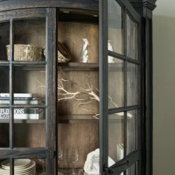 As grand as the Hill Country of Texas, the Mullins Prairie Display Cabinet strikes an epic silhouette with its shaped crown and architectural details. Exuding a vintage appeal, the focal-point cabinet has 2 wood-framed antique seeded glass doors, 3 adjustable wood-framed glass shelves and one fixed shelf and a touch-switch light on the right hinge. The custom-latch hardware has a rustic vibe. The medium wood-tone Washoff finish on the back panel offers a pop of contrast to the rich dark Antique Varnish finish of the case.
