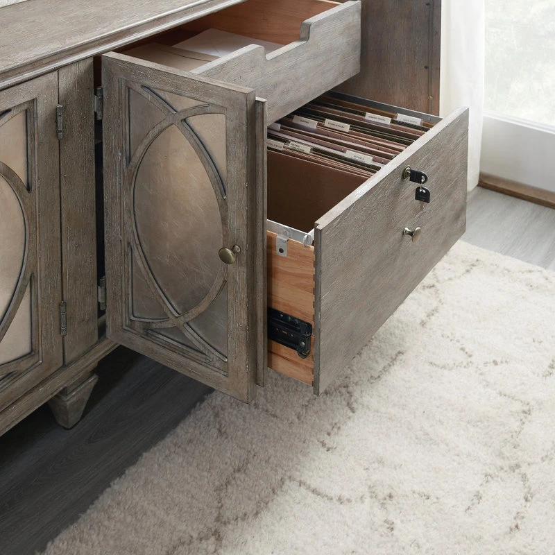 A glamorous and romantic piece for any space ranging from office to living room to entry, the Rustic Glam Credenza is crafted of Quartered White Oak Veneers with shimmery eglomise accents and features four wood-framed doors with softly rounded wood fretwork over the glass. One tray drawer is featured as well as one locking file drawer with pendaflex system behind the right side pair of doors.
