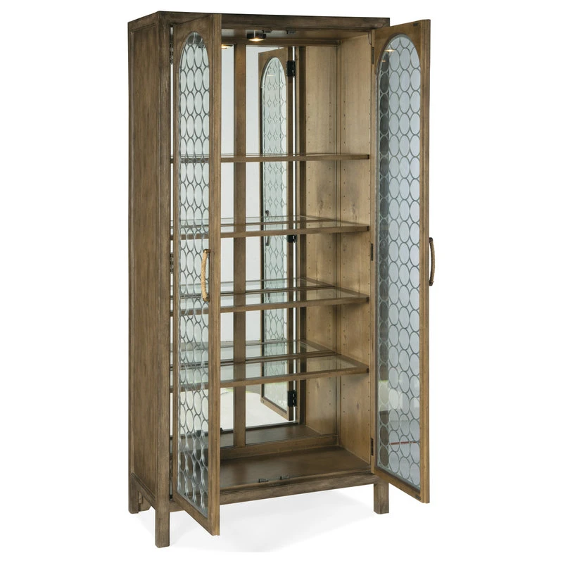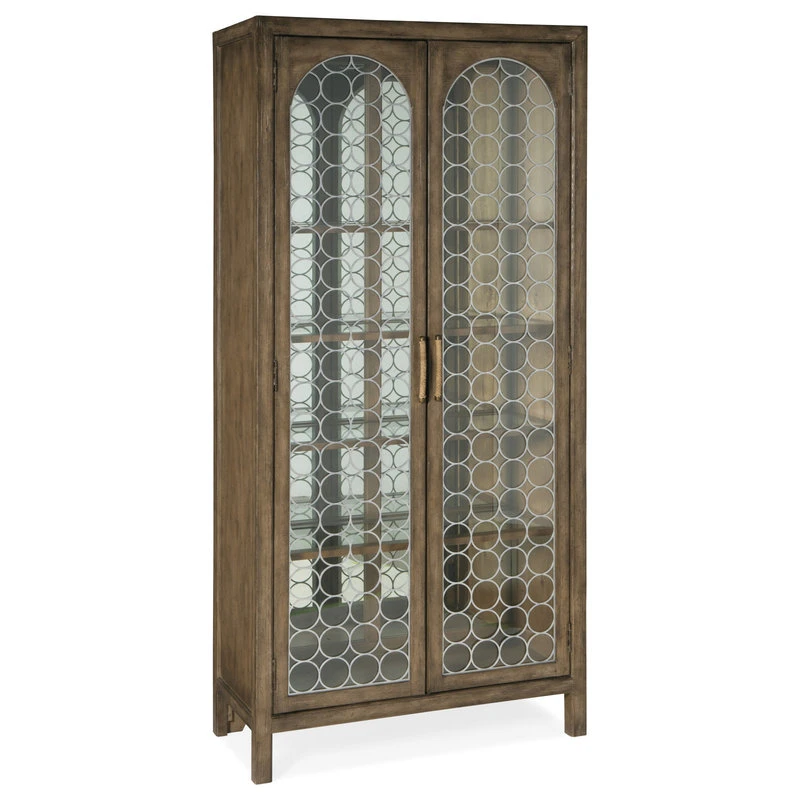 Create a calming resort-inspired retreat in your home with the focal-point-worthy Sundance Display Cabinet. The circular patterned metal fretwork over tempered glass on the door fronts is a designer detail, along with an antique mirror back panel. Behind the doors are 4 adjustable wood-framed glass shelves illuminated by a 3-intensity touch switch. Crafted of Pecan Veneers, the cabinet is finished in Cliffside, a rich, dynamic brown finish with light burnishing on the edges.