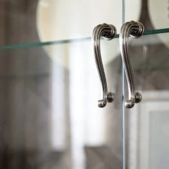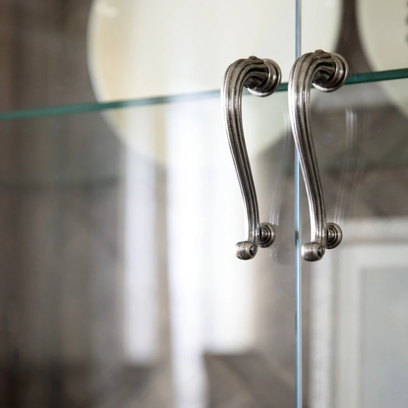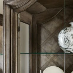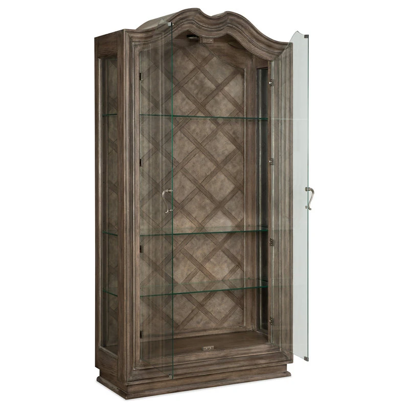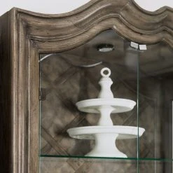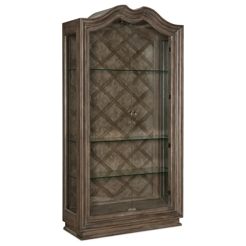 From the carved top to the intricate lattice pattern on the back panel to the two full glass doors and pewter hardware, the Woodlands Display Cabinet is a stunning focal-point piece. Behind the glass doors are four adjustable glass shelves. Crafted of Poplar and Hardwood Solids with Quartered Oak and Primavera Veneers, the cabinet is finished in the serene Heathered Lambswool that melds brown and gray tones.