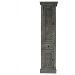 Open the two lattice-patterned doors of this tall linen cabinet to arrange your home items in the five shelves. A pull-out drawer offers easily accessible extra storage space, and a driftwood textured finish exemplifies traditional style.