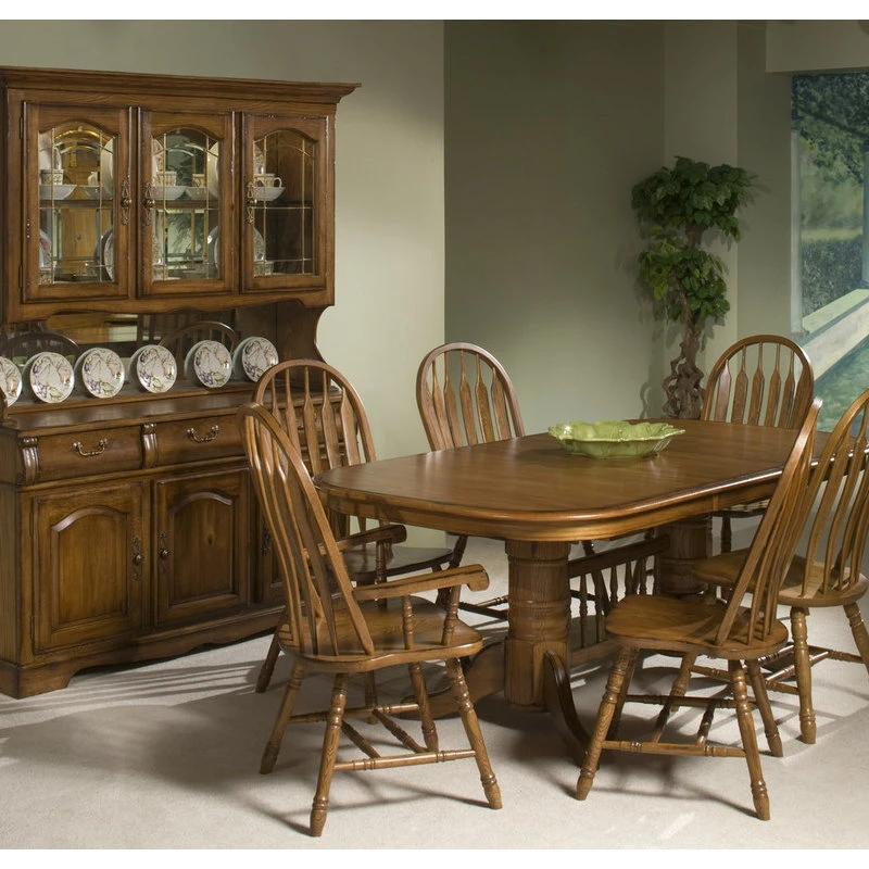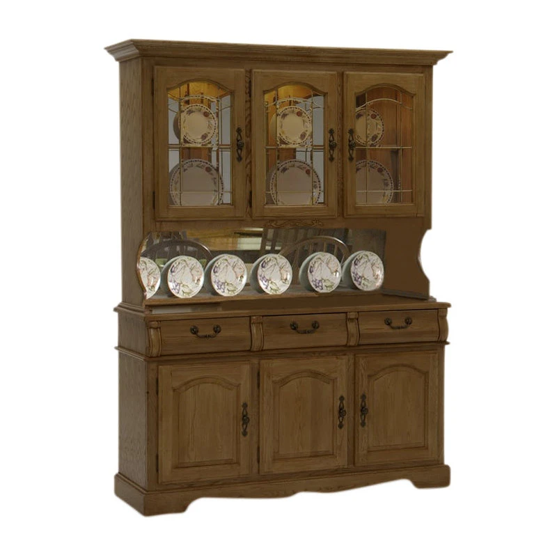 Intercon Furniture Classic Oak 60 China Buffet w/ Hutch in Burnished Rustic Add this combination piece into your dining area to store your fine china or glassware in. This china hutch and buffet combo provides ample room for all your dining accessories. Place fine china inside three amply sized brass and glass paned door front cabinets that feature three phase touch lighting, for safe keeping and elegant display. Below, the buffet provides three drawers for the storage of your silverware or other utensils, while three doors reveal additional space to place extra dishes or bowls within. Enjoy the Traditional look and feel of this combination in your home. Enjoy the warm, inviting look of naturally and burnished finished solid oak with the Classic Oak collection. Featuring various storage pieces and seating combinations, bring the look and feel of quality, handcrafted design into your decor. Pieces feature turned legs and arrow detail backs, while storage pieces provide elegant glass paned doors and several ample sized areas to store glassware, silverware or china within safely. Built from solid oak over lumber core frames, the Classic Oak collection provides durability to last for years to come.