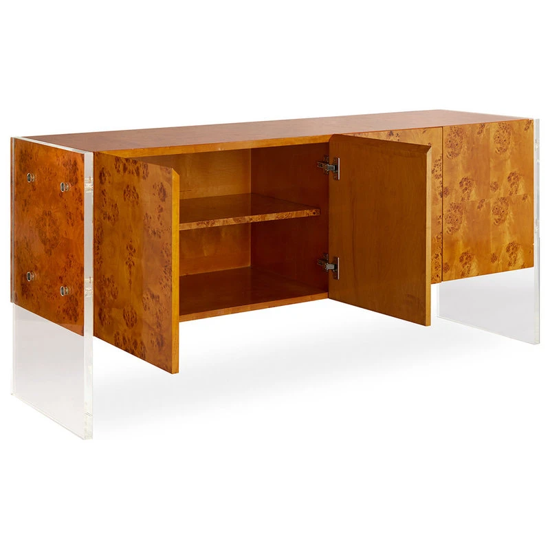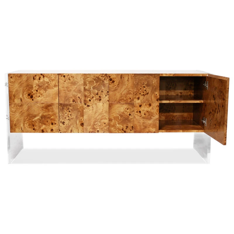 A Minimalist world of burled wood, acrylic panels, and stainless steel. Pieced, burled mappa wood floats between acrylic legs with stainless steel accents. Pieced veneer cabinet faces showcase naturally occurring patterns in the wood, and an adjustable shelf inside provides posh storage. With a fully finished back, this is a fab piece to float in the middle of the room.