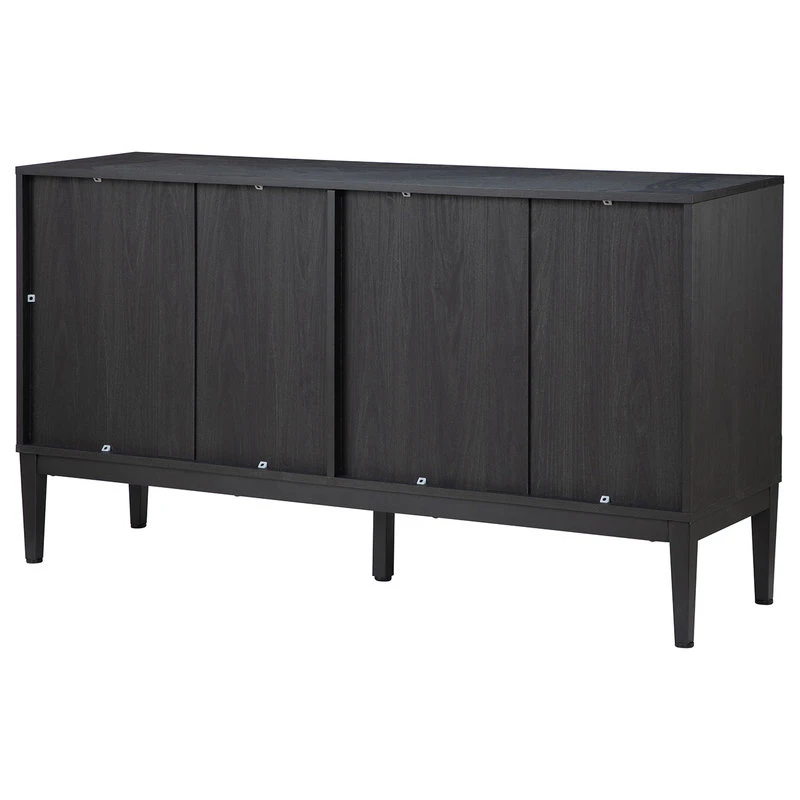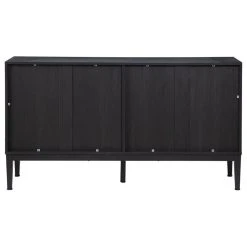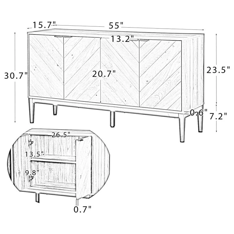It is a stylized sideboard that demands attention with its novel doors decorated in a sleek, elegant, herringbone design. This sideboard has a clean black painted frame and metal legs that have adjustable pads attached to keep it balanced. With 4 swinging doors, this cabinet offers plenty of hidden storage and enough space to keep your home clutter-free, plus, you can tear down the shelves on the sideboard for the perfect amount of space. An all-purpose sideboard can meet your various storage needs as a cabinet or buffet server cupboard in the dining room or kitchen. Waterproof paint on the sideboard surface, and herringbone pattern decorated doors can effectively prevent moisture and dust. The classic black cabinet and wood color doors combined retro and modern can be suitable for various styles of home decoration, adding a touch of unadorned elegance to your space.