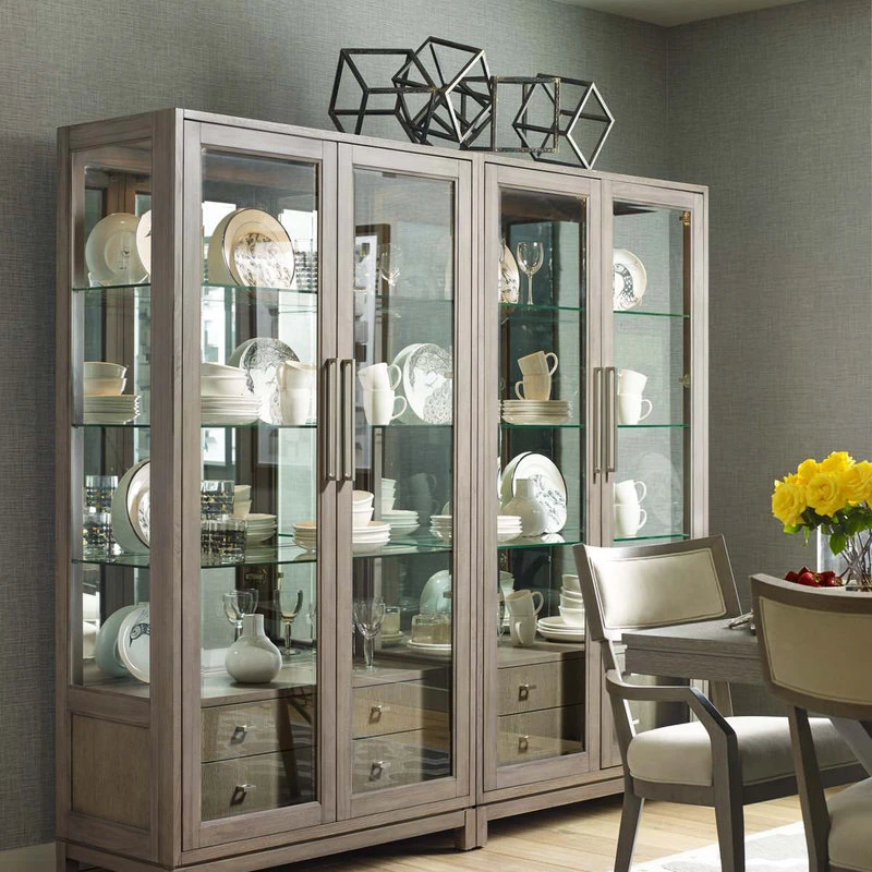 The Highline glass display cabinet features 2 glass doors with 2 interior drawers at the base. A silver tray is located in the top drawer for all of your cutlery storage needs. Three adjustable shelves are the perfect location to display collectibles or fine China as they are complete with plate grooves. The mirrored back and 3 way touch light highlight and emphasize the cabinet accessories. The Highline collection is a reflection of the heart of New York City: Bold and fresh. Born of clean, modern styling and rich textural finishes, inviting you to relax without all the clutter, and unwind in beautiful surroundings. Crafted of Hardwood Solids with White Oak Veneers in a soothing Griege finish. Soft Nickel finished, custom hardware and accents add a quietly refined touch.