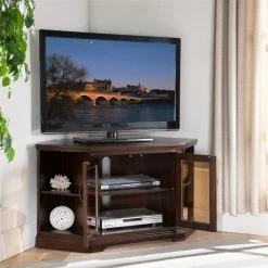 This 46″ Chocolate Cherry Corner TV Stand holds popular TV sizes from 32″ to 50″. The clipped back corners of this clever design nestle deeply into the corner and enlarge your living space. Features include infrared friendly, bronze tinted door glass offering dust-free storage for electronics. Open cabinet ends offer bookcase or display opportunities within easy reach. A Chocolate cherry finish is applied to solid wood and wood veneers for a durable, protective finish. Assembles easily in minutes with a clever, hinge method construction.