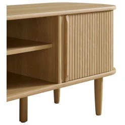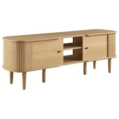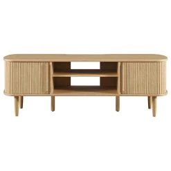 Invite mid-century aesthetics into your living space with the Contour 55″ TV Stand. Contour features retro beadboard and an organic silhouette and stands on four tapered legs with two support legs. Crafted with rubberwood, MDF, and particleboard, this entertainment console is complete with a center storage area with an adjustable shelf and open back, as well as two side storage areas with sliding doors to conceal. This media stand accommodates TVs up to 60″ and is the perfect modern addition to the living room, lounge area, or recreation room. Assembly required. Weight Capacity: 163 lbs.