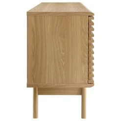 Tap into mid-century aesthetics with the Render 71″ TV Stand. This installment of the Render collection features a durable particleboard frame with smooth walnut grain laminate, four tapered wood legs, an adjustable shelf on both sides, two cable management holes, side vertical storage areas, and two bottom-hinged doors for easy access to shelf storage. This versatile mid-century modern living room table features a solid construction with a pleasing look and practical functionality. Perfect for media storage, Render accommodates flat-screen TVs up to 78″ wide.