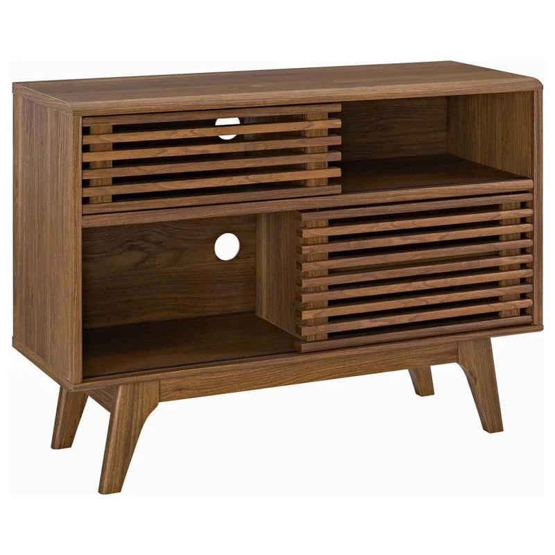 Tap into mid-century aesthetics with the Render Display Stand. Render features a durable particleboard frame with smooth walnut grain veneer, four tapered wood legs, four storage spaces with an adjustable shelf in the lower right section, non-marking foam foot pads, and dual slatted sliding doors for sophisticated living room or entryway storage. Complete with cable management holes on both sides, Render’s contemporary linear style is the perfect display stand for books, magazines, pictures, table lamps, and indoor plants.