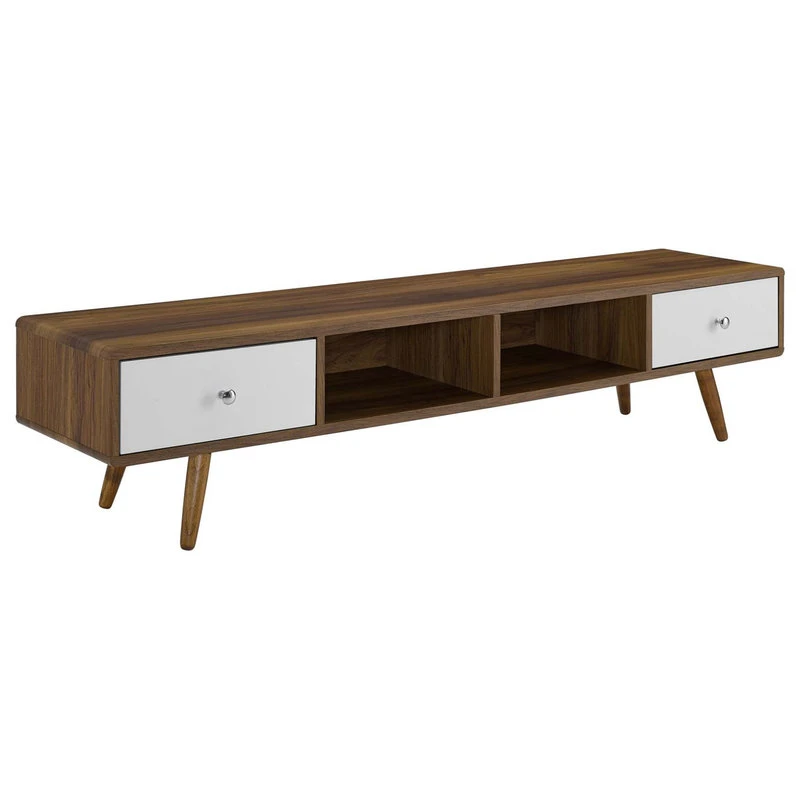 Harness the iconic energy of mid-century modern style with the Transmit 70″ TV Stand. Transmit features two spacious full-extension white lacquer drawers, two media storage cubbies with cable management holes, and four splayed and tapered wood legs which further enhance the streamlined profile and sophisticated look of this media console TV stand. Made of durable particleboard and MDF with smooth walnut grain veneer, Transmit makes it easy to manage your media needs while keeping your space looking visually clean. Transmit is the perfect low profile TV stand for the contemporary home.