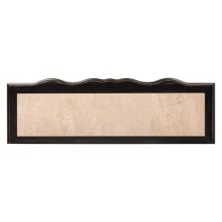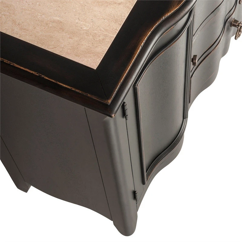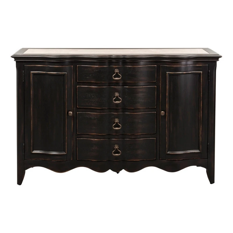 Enhance your space with the Chesapeake server. Crafted of rubberwood solids and cathedral hickory veneers, this piece features a wire brushed antique black finish, heavy rub through and distressing, a unique serpentine shape to the front of the case, four full extension drawers including a felt silverware tray liner in the top drawer and a cedar lined bottom drawer, two wood framed doors with one adjustable shelf behind each door, a scalloped base rail, and a marble top inset. Chesapeake offers a combination of soft shapes with an antique black finish creates a casual traditional style