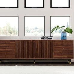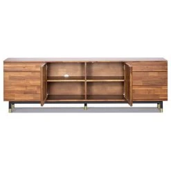 Soho is a mid-century style TV stand, with a long rectangular body. It is crafty design that features six small drawers on the side and two cabinets in the middle that open up for more shelving space. The body is a solid acacia natural finish that portrays all of the natural features of the wood. The wood is complimented by the gold knobs and and legs, which overall ties this design together.