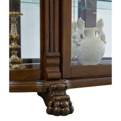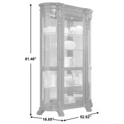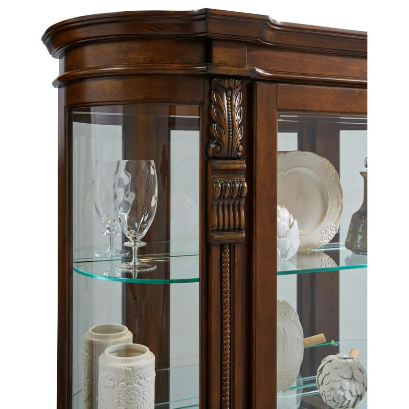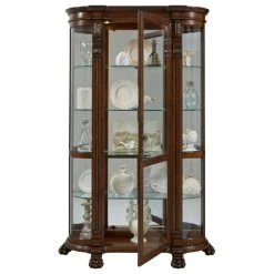 With all the character of a period 19th century English piece, our curio will add style and eloquence to your collection. Notice the unique curved ends, scrolled brackets with capitals, and Venetian foot. This stately curio is solidly built in select hardwood solids and veneers with our deep brown Foxcroft finish. It has a mirrored back, beveled glass on the front, halogen lighting, adjustable glass shelves, and adjustable glides for leveling.