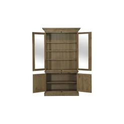 - Features 2 wood framed tempered glass doors that open to reveal 3 adjustable wood framed glass shelves