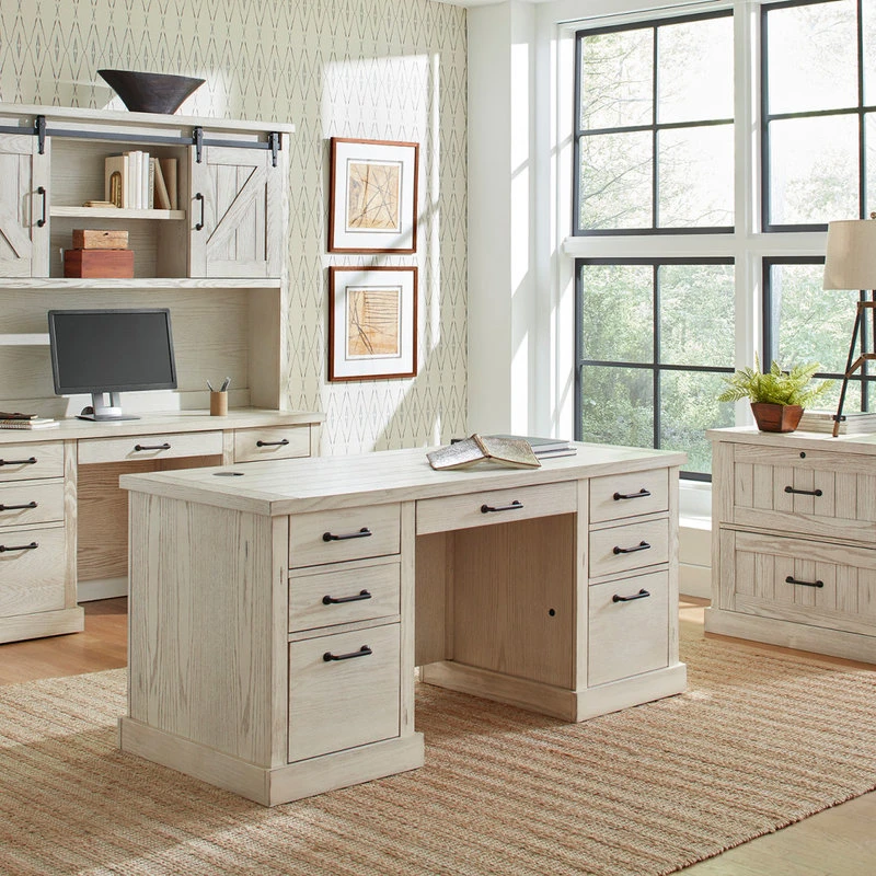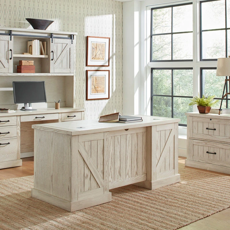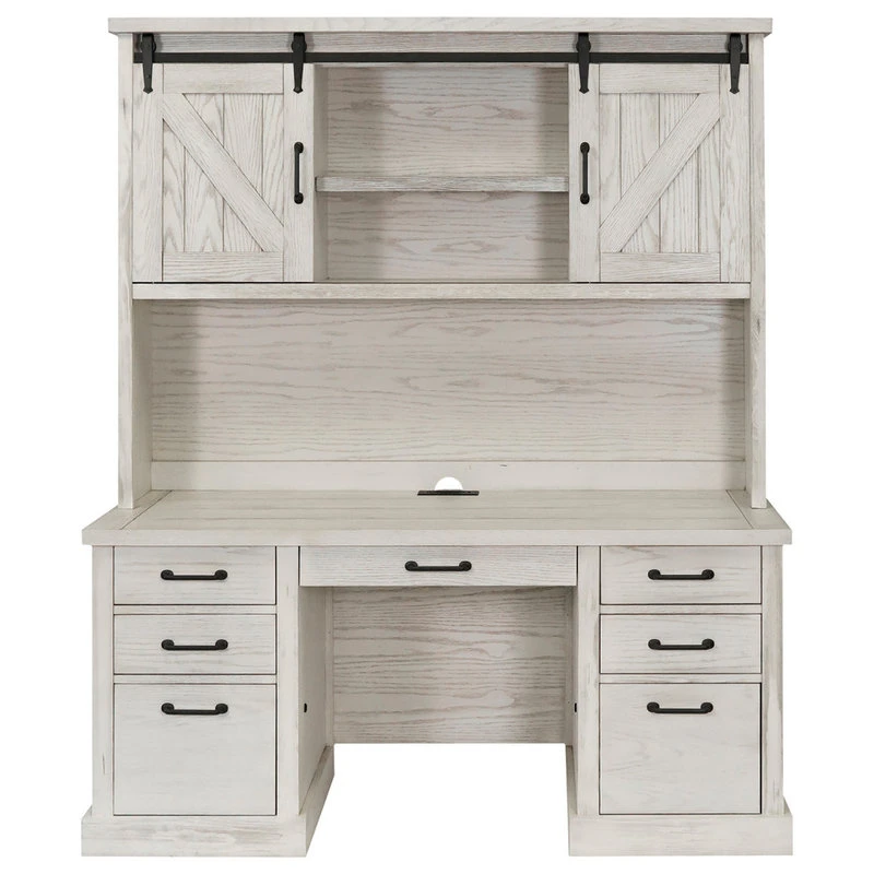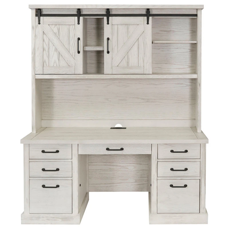 From the steel rails and exposed wheels to the mortise and tenon details, Avondale speaks to simplicity. The weathered white oak finish is distressed to deliberately highlight it’s age and compliments the basic barn door style with heavy plank tops and timber legs. Avondale’s classic look with rustic wood and authentic hardware has clearly withstood the test of time. (Desk not included.)