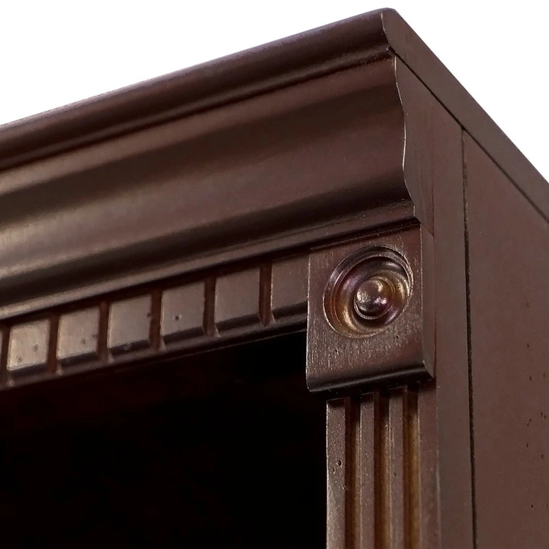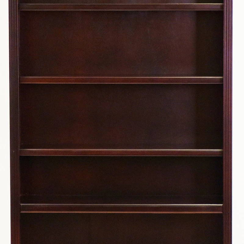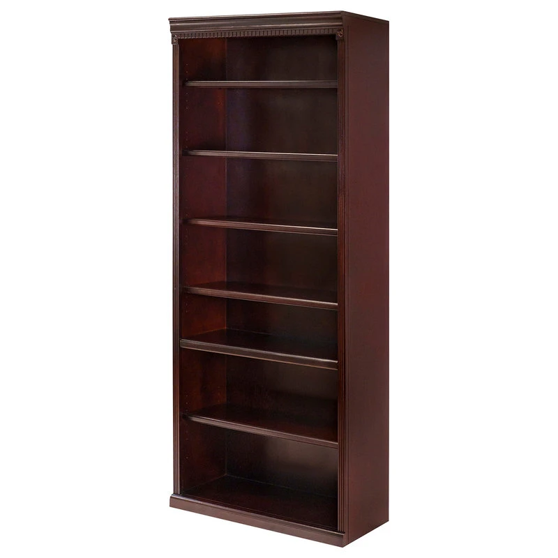 Huntington Club is a transitional furniture design with a vibrant cherry finish on hardwood solids and veneers. Vertical fluting, dentil molding and light distressing add character and aesthetic appeal. Huntington Club is a great addition to any home and will surely last for generations to come. The seven shelf wood bookcase has two fixed shelves for increased stability, five adjustable shelves, a semi-finished back and arrives fully assembled.