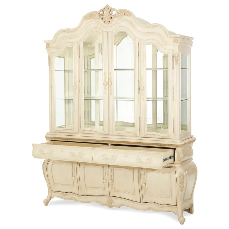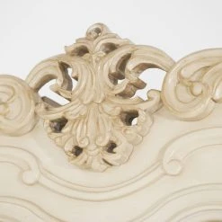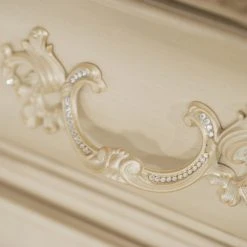 The influence of French regal comes to life with unique scallop shaped pieces throughout the collection. A classic French look, with a chic twist depicting a hip, couture feel, the upholstered pieces in the Lavelle collection exude class and style. Beveled inlaid glass, plush upholstery, generous storage and display spaces are harmoniously tied together with antique hardware and genuine Swarovski crystal accents highlighting the design, detail, and style of the Lavelle collection.