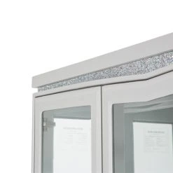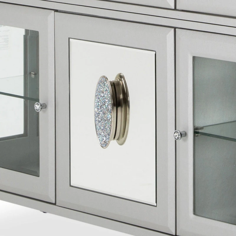 - Door pulls feature crystal inserts.