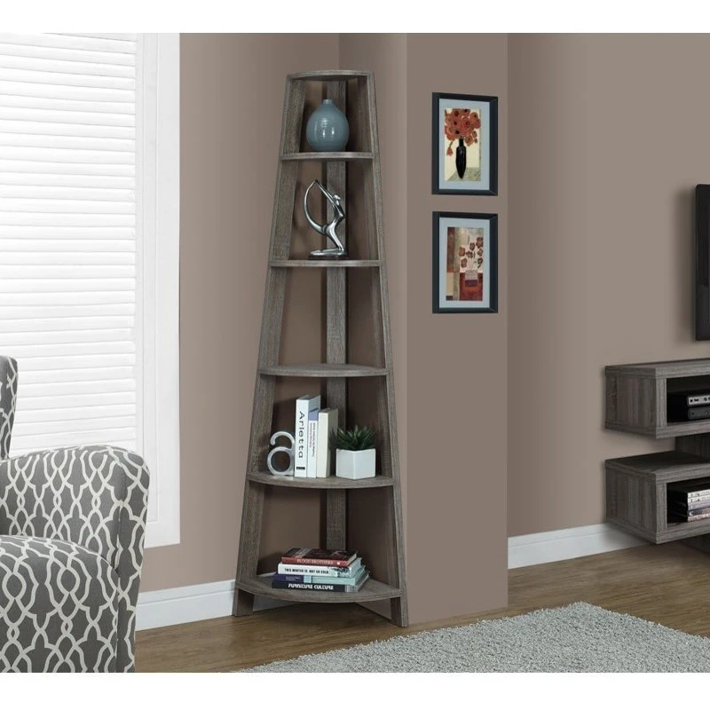 Add the perfect corner piece to any room with this elegant dark taupe reclaimed wood-look accent tagre complete with five fixed tray style shelves. This contemporary/transitional designed bookcase blends well with any type of dcor, providing additional display space without sacrificing style. Use it in a corner of your living room, family room, guest room, home office, or hallway for a tidy way to store your books and showcase your accent pieces.