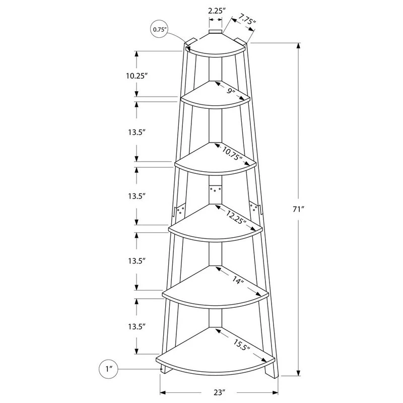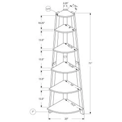 - Top shelf: 11.5″Lx8″Dx10″H; 2nd: 15″Lx9.5″Dx13.5″H; 3rd: 17″Lx11″Dx13.5″H; 4th: 19″Lx13″Dx13.5″H;5th: 21.5″Lx14.5″Dx13.5″H