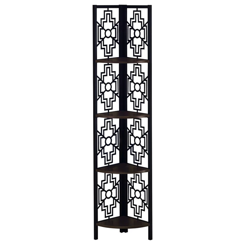 Let this stylish corner cabinet conquer the clutter in your small home, apartment or condo by providing 4 solid dark brown display shelves that are perfect for photo frames, plants, other decorative items and even kitchen accessories. Perfect for decluttering, this black metal corner cabinet features a transitional design that will elevate the look of your living room, bedroom, kitchen or office. This corner storage accent piece will add a touch of elegance to any room in your home.