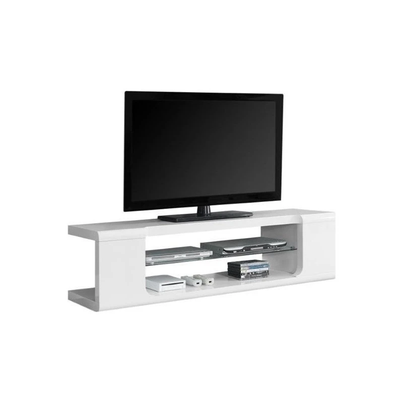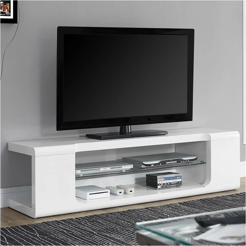 Modernize your space with this contemporary style TV console. Featuring a solid 60″L top and a tempered glass shelf along with a bottom shelf to place your audio/visual/gaming components or decorative objects. This durable console designed with retro style rounded edges and finished in a sleek glossy white, fits perfectly in a living room, den, or basement to showcase your latest high tech gadgets. Accommodates all TV sizes with a center stand.