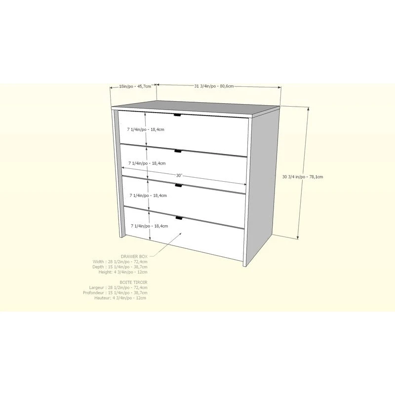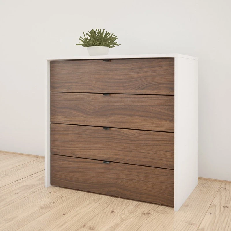 Nexera 4-drawer chest is offered in a trendy white and walnut finish bringing both storage space and modern flair to your bedroom. The top panel is made of scratch, water and stain resistant melamine which combines style and functionality. The 4 drawers are mounted on solid metal slides and provide convenient storage for your clothes and personal belongings.