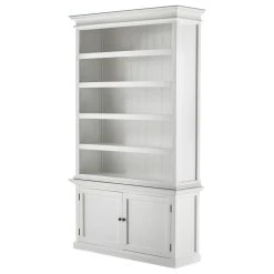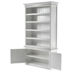 You cannot go wrong with a beautiful hutch in your home, and this one is no exception. Finished in Classic White and accented with Antique Brass hardware, this mahogany hutch features five open fixed shelves in the upper portion, two shelving compartments behind the shaker style doors, and plenty of personality. This stately piece would be perfect for a living room, dining room or even a bedroom, adding storage and a place to display precious items.