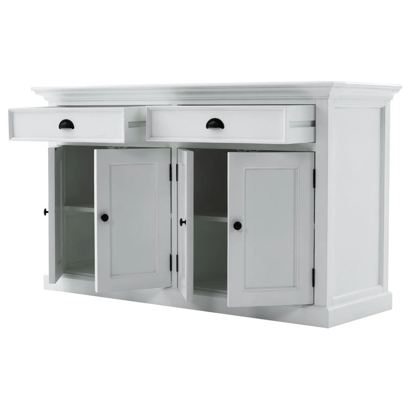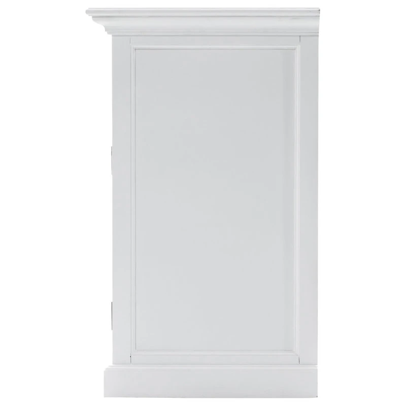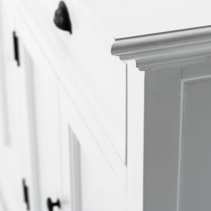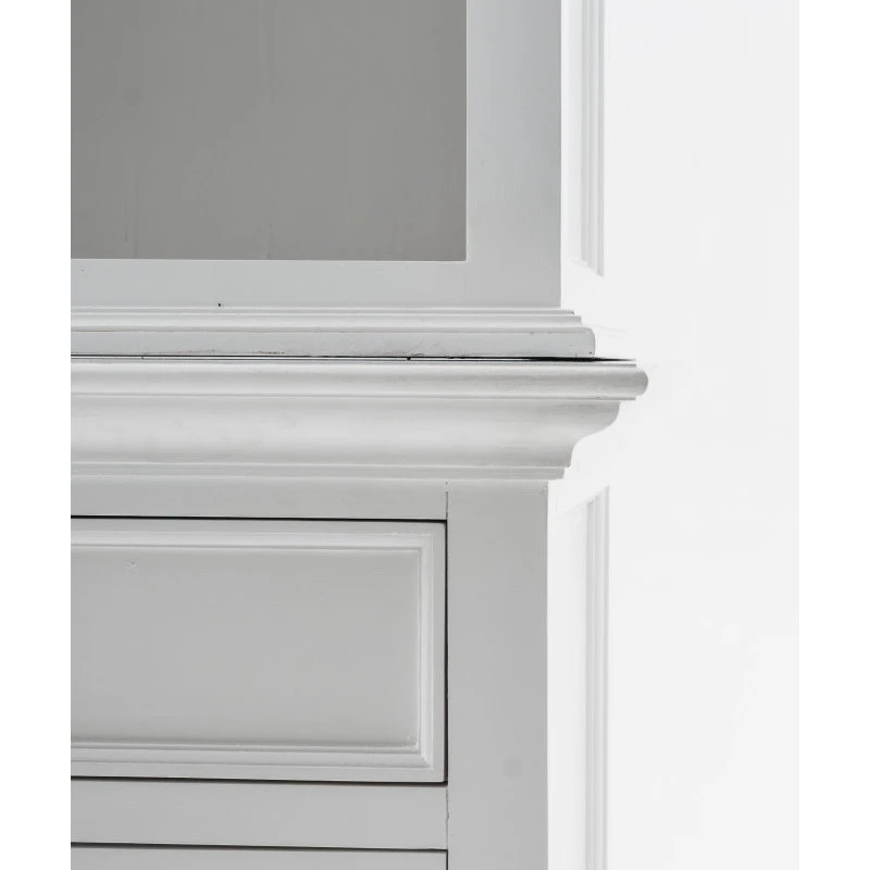 This generously proportioned and versatile hutch unit can find its home in your living room or bedroom. Two separate components working together to create ideal storage. The base unit, with its combination of drawers and deep shelving, can be home to personal items or linens. The upper shelving unit features detailed beadboard wainscotting, that acts as an attractive backdrop for books or collectibles.