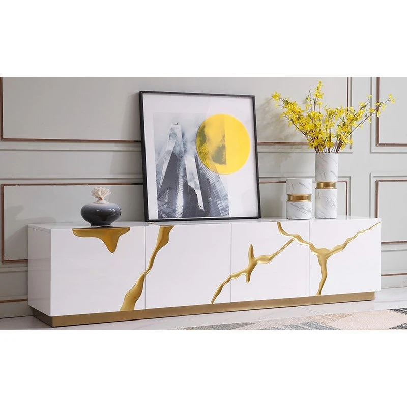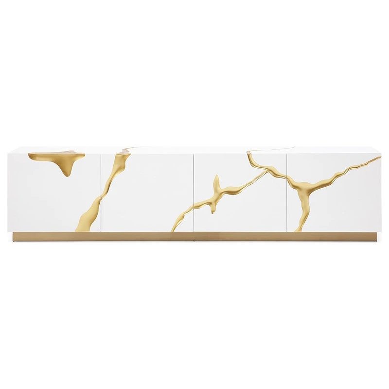 Worthy of its own award show, Paramount TV stand gives you enough top shelf space for even the grandest of television sets. 4 Doors cover storage space for your connected electronics along with other items you donโt want in plain sight. This TV stand has a high gloss white finish along with its bling worthy gold colored โliquidโ details and metal support base.