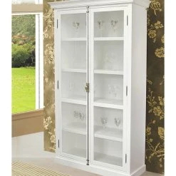 33 inches high Oriental wall curio for miniatures. Beveled glass, and brass hangars. Shiny Black with hand painted Japanese landscape and 19 shelves for miniatures. Hang on a wall or free standing ,solid wood construction measures Dimensions: 20 x 5.5 x 33 inches tall. We suggest just dusting for maintenance.